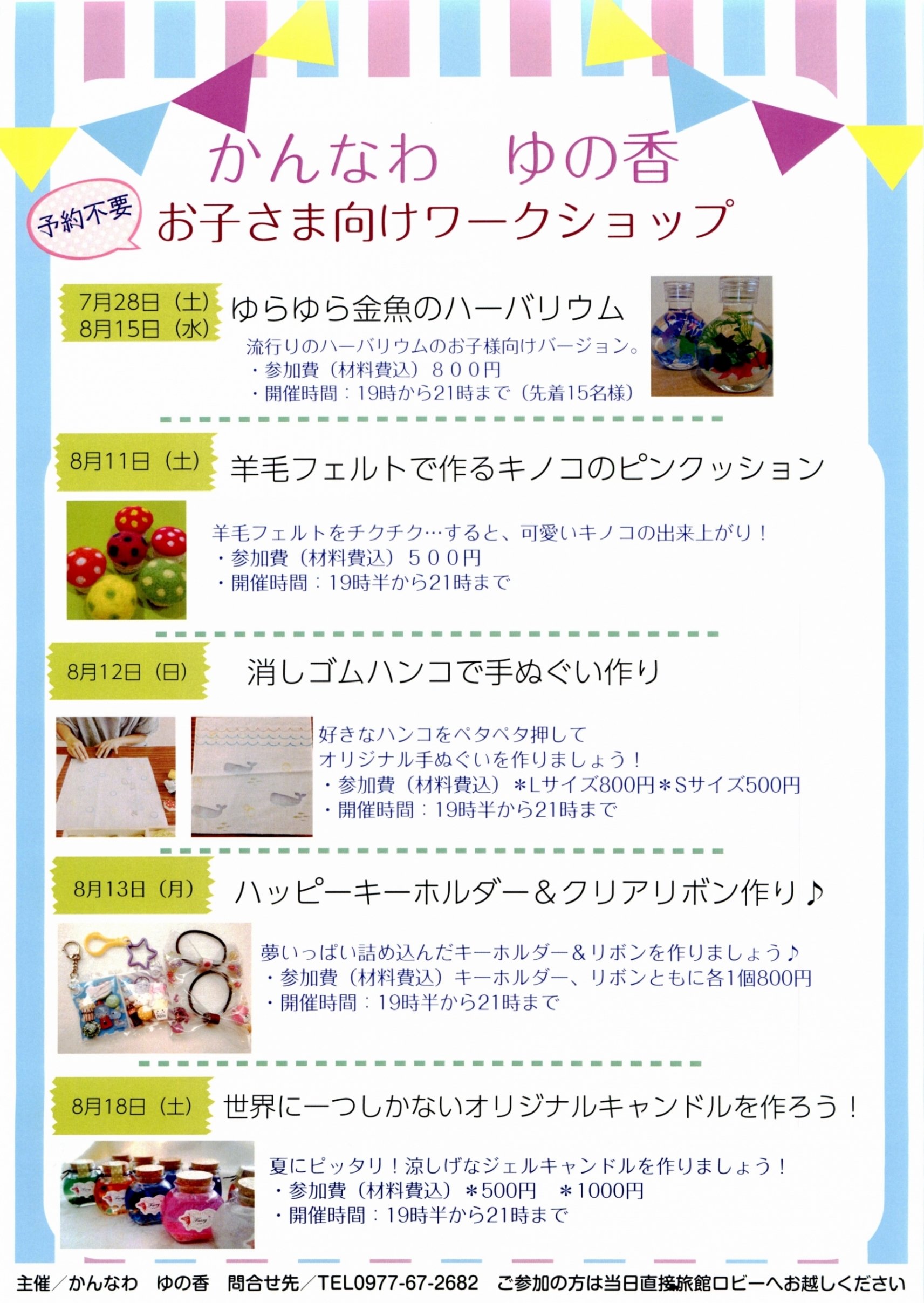 夏休みの工作もバッチリ!親子ワークショップのお知らせ 2018.08.09 旅館 ツイート ◇夏休みの工作はこれでバッチリ!◇ こんばんは~。 お盆の期間は、親子ワークショップを5回開催いたします! 予約不要ですので、直接旅館へお越しください。 詳しくはチラシの画像をクリックしてくださいね~。 お問合せは 0977-67-2682 かんなわ ゆの香まで! 皆さまのお越しをお待ちしています。