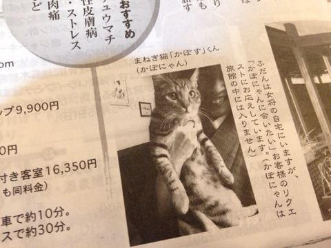 温泉博士3月号にてかぼにゃん誌面デビュー! 2015.02.07 招き猫かぼす ツイート かぼにゃんだにゃー。 いつも、ブログを読んでくれてありがとにゃ♪ 昨日もブログを読んでくれたお客様が、かぼにゃんと遊んでくれたにゃー(≧∇≦) かぼにゃん人気者だにゃ(^_^)v かぼにゃん、雑誌にも出たにゃ! 良く撮れてるんだにゃ! かぼにゃん、字が読めないけどいいこと書いてるにゃ? おんせんはかせっていう本だにゃー。 コンビニや本屋さんにあるにゃ。 ゆの香のことも書いてるから読んでと、女将が言ってるから、かぼにゃんを見るついでに読んでにゃo(^_-)O これからも、かぼにゃんをよろしくにゃ♪ リクエストがあったらいつでも呼んでにゃ!